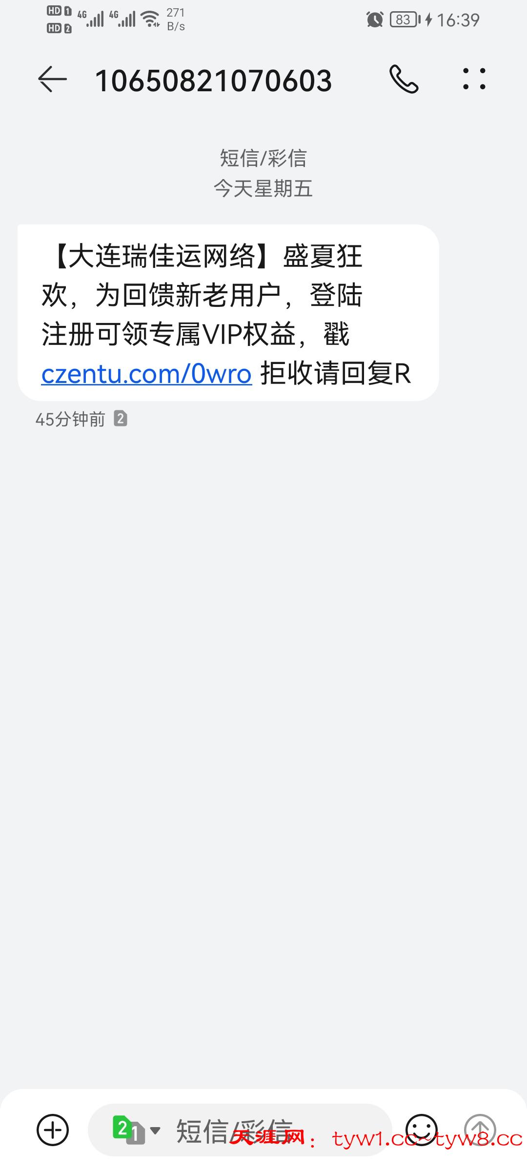短信链接:【大连瑞佳运网络】盛夏狂欢,为回馈新老用户,登陆注册可领专属VIP权益,戳 czentu.com/0wro 拒收请回复R a333.app 送18 200提,