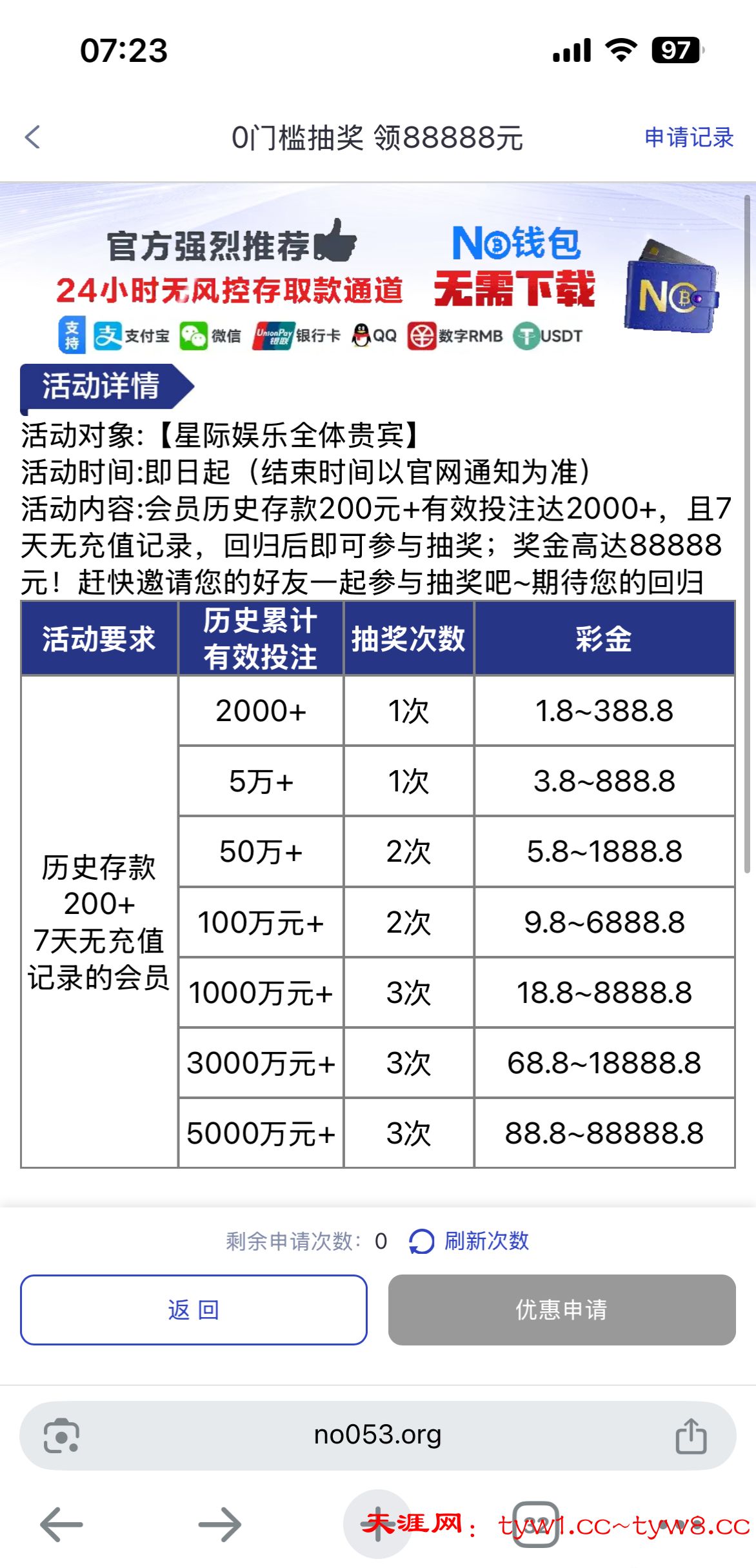 我老号充值过v3,一年没充值了,申请打码2000+安排了3.8,回归活动4自助申请网址:053.am